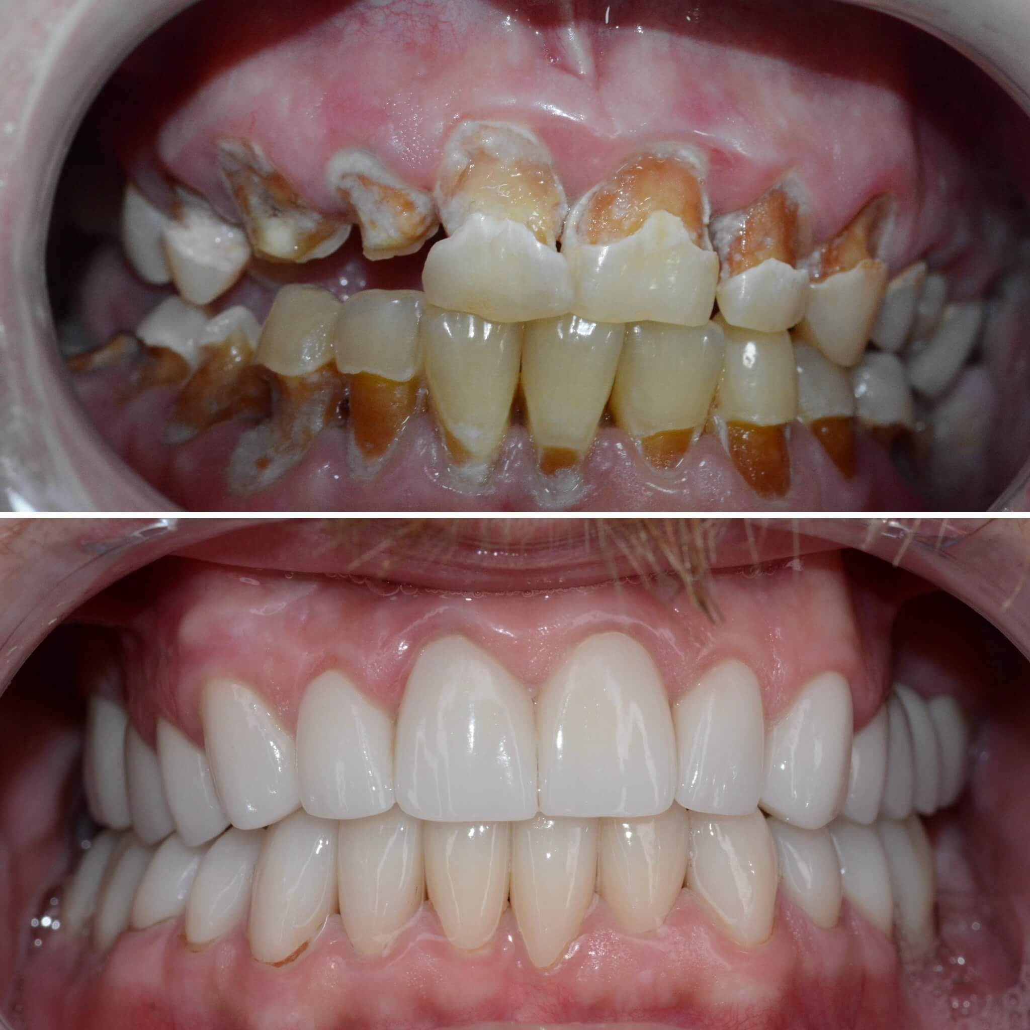 Pacientul s-a prezentat cu dinți uzați, colorați, pierderi de structură dentară și poziții inestetice. Disconfortul era atât funcțional, cât și estetic.